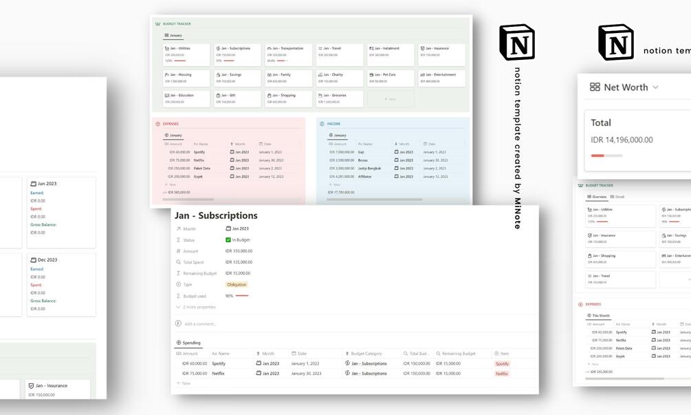 - Home dashboard with Summary of Total Net Worth, Monthly Overview, Budget Tracker, Daily Expenses & Income